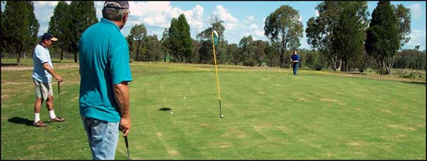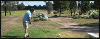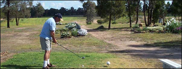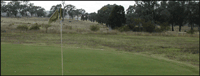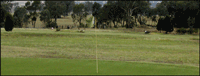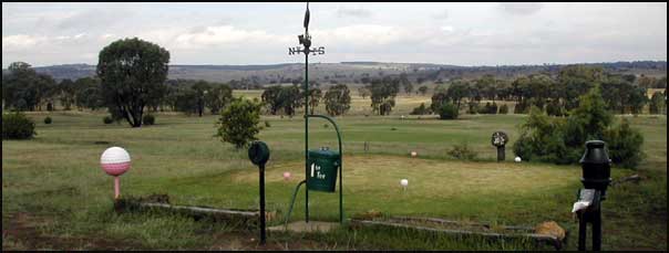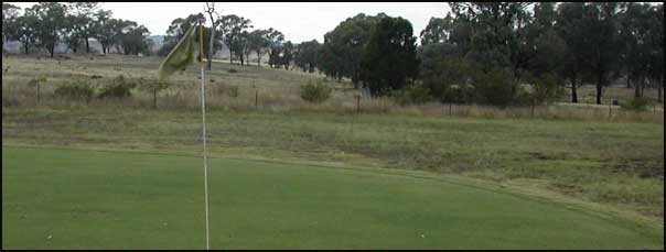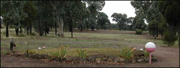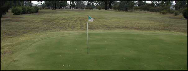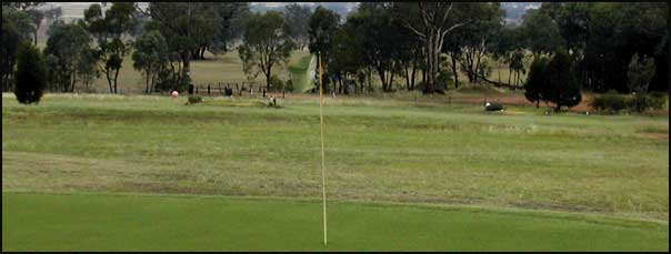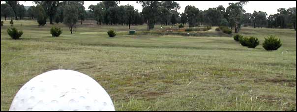 A fairway narrowed by towering ironbark trees, does a gentle dog leg to the right to a level green on a downslope. Watch for kangaroos.
